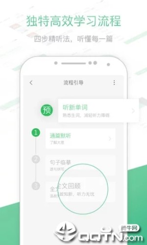 2)科学的学习流程。听一篇文章就像上一堂听力课,听新单词、泛听文章、句子临摹、全文回顾,各个环节层层递进,全方位掌握文章。