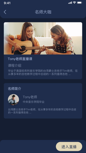- 平台结合各地机构及教师线下课程,推出1+6的教学理念,通过线上教学模式为教师及学生提供全面的教学服务,包括主体管理课程,以及游戏练习、自主练习、在线陪练、乐理知识、视唱练耳及音乐素养六大板块的辅助教学。