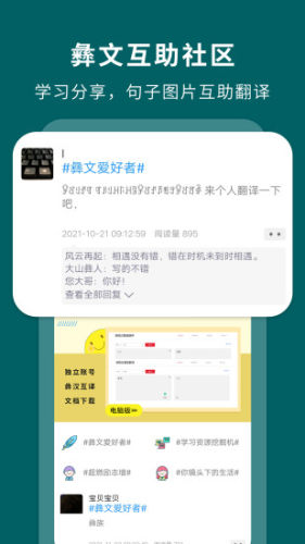 ·互助社区:是讨论有关彝文的任何问题的一个地方,可以发布寻求彝文翻译的图片,然后等待热心的同伴帮忙解答