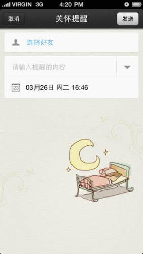 QQ提醒iPhone版主要拥有小闹钟、生日、节假日、游戏提醒功能,此外还有游戏礼包免费领取,还能关心你的朋友,送她一个温馨的提醒!