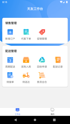 天友管家app,天友乳业掌上办公系统。软件支持业务员、配送员、仓管员等角色登录,拥有销售管理、配送管理、订单管理等功能,帮助天友乳业员工提高工作效率。