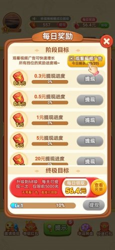 1、每次成功通关即可领取一次红包,奖励非常的丰厚,里面还有个红包存钱罐模块,当日观看视频赚取的红包劵都会存入在这里,第二天就可以来领取啦;