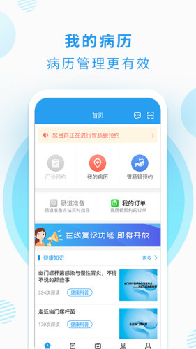 消化内镜患者端app,可以帮助患者进行肠道准备的应用;我的病历,病历管理更有效;健康知识,健康知识更丰富;我的订单,订单信息更明确我的,个人功能更齐全。