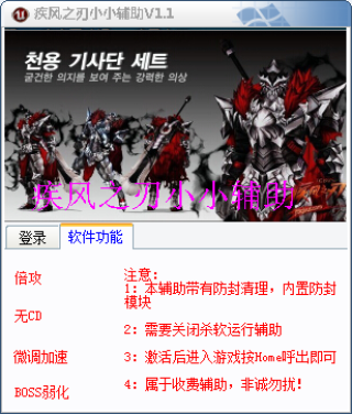 疾风之刃小小辅助主要提供了四项功能,让你享受英雄攻击双倍,技能免费cd使用等效果。激活后进入游戏按Home呼出即可使用。