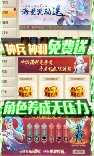 1.登录送千元元宝卡礼包!送上线福利礼包!打开可获得元宝*18888,绑元*58888!角色养成毫无压力!