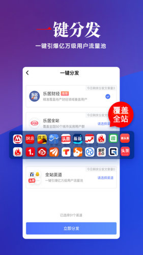 支持一键分发乐居全站,覆盖300多个城市买房用户群;支持一键分发全站渠道,引爆亿万级用户流量池;