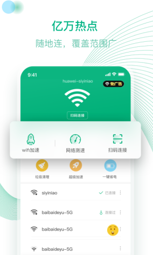 致力于为用户提供免费、安全、稳定的上网服务,让用户随时随地轻松接入无线网络,使用各种在线服务,不再为无网、断网而苦恼,是您的WiFi连接常用工具。