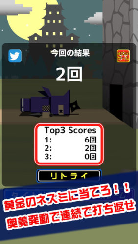 当然,《忍者乒乓》内容并不会这么简单,途中还会有不同颜色的老鼠跳出来。如果手里剑遇到白色老鼠就会马上折返,遇到蓝色老鼠则会速度变慢,遇到红色老鼠则会变快,遇到金色老鼠则会在一定时间内快速自动往返。