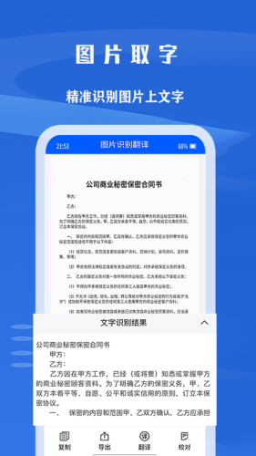 对于识别后的文字我们还可以进行在线翻译、编辑、内容复制、实时校对、重新识别、导出,是免费专业的拍照取字OCR识别软件。