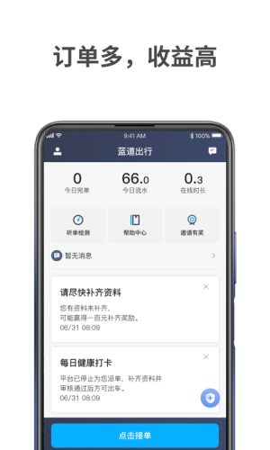 蓝道出行司机App,由杭州钧硕科技有限公司开发的,为旗下出行平台入驻司机们打造的掌上接单助手,超多订单自由抢单,收入水流一目了然,做得多收益高。