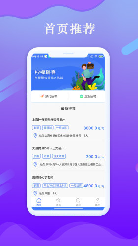 柠檬聘客app下载,为小伙伴们整合海量优质招聘信息,通过柠檬聘客app可以随时随地找工作,各类岗位各种机会,智能匹配双向选择,欢迎下载了解。