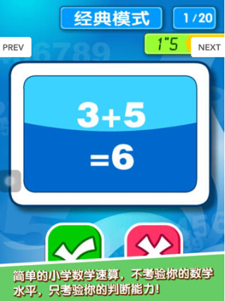 疯狂算术题是是一款益智小游戏。一题题简单的小学数学速算,不考验你的数学水平,只考验你的判断和计算能力!一玩上瘾,不管你信不信,反正我信了,上瘾只需1秒!看题、判断、选择、上瘾!
