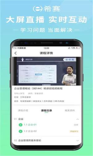希赛自考-自考本科自考专科题库;高清视频,知识精讲,节省学习时间,解析学习难点;海量好体,专家解析,历年真题,每日一练免费刷;体验课程,章节视听,精准了解专业课程内容;大屏直播,实时互动,学习问题,当面解决。