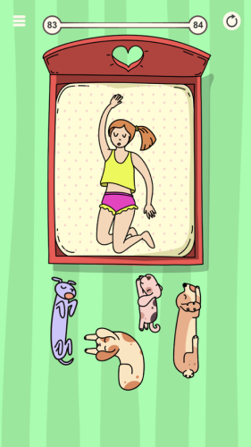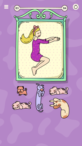 一款休闲趣味小游戏。主人早早的就上床睡觉了,让我们把这些可爱的小猫小狗也放在床上陪伴主人睡觉吧!每一个关卡主人睡觉的姿势都不一样,占用的床的面积大小也不一样,我们要怎样才能将小猫小狗塞到剩下的部分呢?趣味的挑战开始啦!