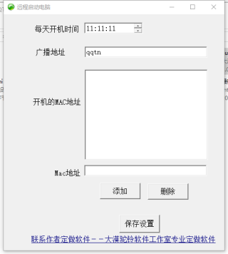 大漠驼铃远程开机工具是一款小巧实用的开机助手,设置好开机时间,广播IP(如果网段是192.168.0.X,则设置为192.168.0.255),然后把需要启动开机的电脑mac地址添加进来。这样只需要局域网中有一台电脑开着,运行这个小工具,其他电脑就可以按时开机了。