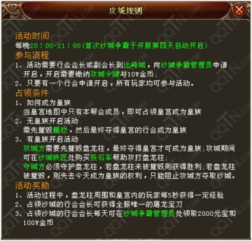 在活动期间内,组织行会成员攻入沙城皇宫,并且在皇宫地图中只有本行会的成员,即临时占领皇城,直至活动结束,结束时占领皇城的行会最终获得胜利,成为沙城之主!