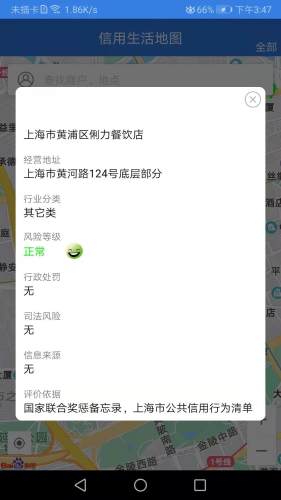 信用生活地图APP是一款提供服务企业风险信息展示和引导的公益性软件,基于用户位置信息按照红、黄、绿三色显示周边范围内商业服务机构的风险状况,智能推荐周边的低风险服务机构,同时将有效降低商家与消费者的信息不对称,鼓励用户选择风险较低的商家。