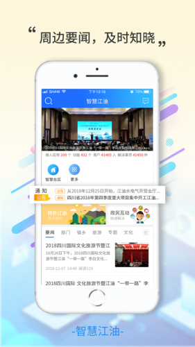 智慧江油(江油市民云)APP,依托江油智慧城市整体建设,面向江油市民的一站式“互联网+”城市服务平台,平台将为市民提供民生缴费、政务服务、智慧社区、文体教育、医疗健康、交通旅游等全方位的信息服务。