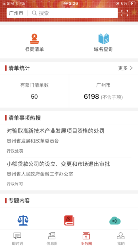 包含业务功能圈和信息交流圈两项主要功能,方便用户随时查询三定信息、权责清单、法律法规,并交流共享经验心得和权威资料。