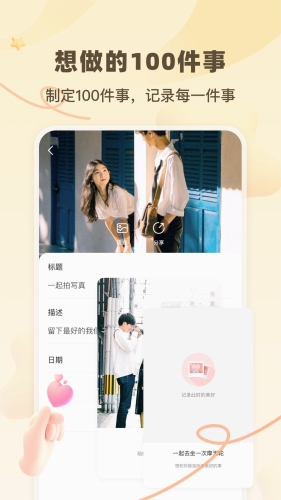 一百件事是一款专门为情侣、朋友、家人、闺蜜打造的100件温暖、甜蜜、有趣、给日常生活加点新鲜感的小事记录软件,涵盖文艺、生活、旅行、吃货、运动、趣味等事件,每一件事都可以让生活充满美好,这一刻最重要的事就是陪你一起记录。