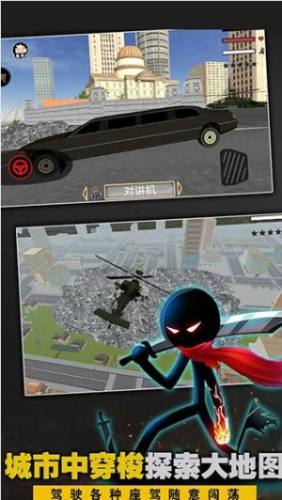 黑铁火柴人绳索英雄是一款类似gta玩法的游戏,在开放的城市中自由探索,跟着剧情探索或者开启狂战士模式面对一个城市的敌人,无限金币无限钻石!