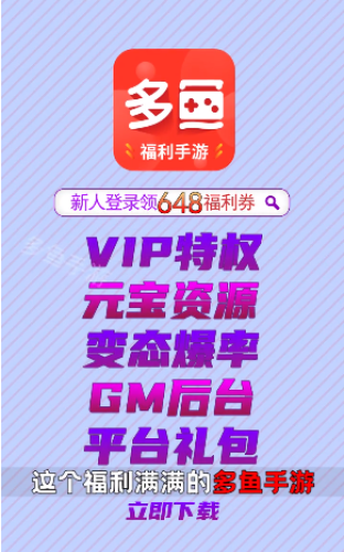 【多鱼全新版】登录即送648首充券!上线就满V,BOSS无限刷!一款手游折扣福利平台,海量的折扣手游充值,内置热门游戏,支持变态版手游福利欢乐送。还有手游礼包等你来领取。