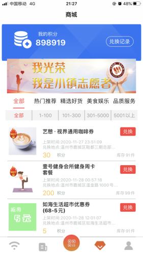 6.积分兑换。注册用户可通过每日登录及参与志愿活动等获得积分,所获积分可用于积分商城内兑换类如10GB移动流量、美食娱乐和品质生活消费券等丰富活动资源。