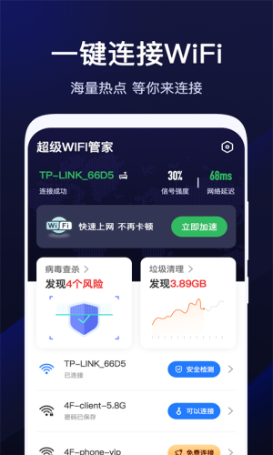 超级WiFi管家app,随时随地一键连WiFi,安全上网,方便省心。智能检测WiFi信息,海量热点任你挑选,随时随地免费上网,享受更优质的上网服务,更安全、更快捷。