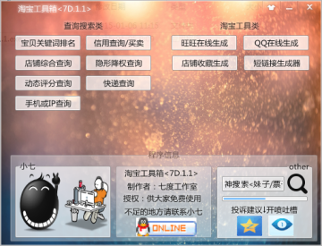 七度淘宝工具箱是一款卖家综合工具箱软件,为广大淘宝卖家免费提供多项实用功能。工具一共分为查询搜索类和淘宝工具两大类,所有功能及服务完全免费使用。后续更新会添加更多新功能,欢迎持续关注!