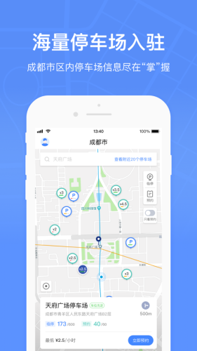 成都停车平台基于行业领先的技术,为广大市民提供发布车位共享、预约共享停车、临时停车支付服务;