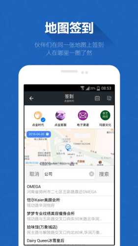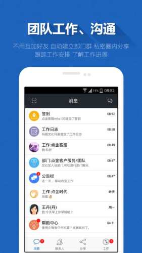 员工圈、实时查岗、企业秀、员工圈、易办事、审批、考勤等功能。