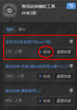4.在傲视战神辅助工具中“启动”“傲视战神全自动任务急速升级(win7版)”