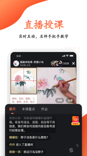 观鱼学堂app是一款书画在线教育平台,平台拥有名师直播,专业点评,互动社区,学习商城等等功能服务,可以帮助更好的学习书画。