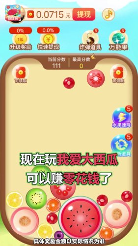 我爱大西瓜,作为全新赚钱游戏,只要合成西瓜就能赚钱,合成10个西瓜,就有3块钱,福利力度还是很大的,最重要的是不用看广告无门槛提现30、50、100元红包轻松到账。