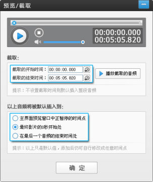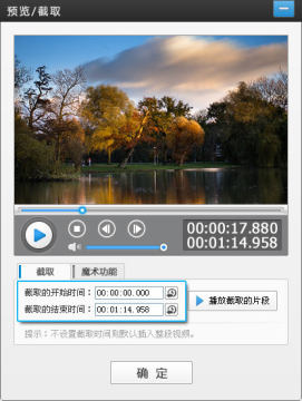 2、添加视频进入“预览/截取”对话框后,在该对话框截取视频片段(关于截取视频片段的详细技巧,可查看)。如果不需要截取视频片段,那我们可以直接点击“确定”按钮,将视频导入爱剪辑。