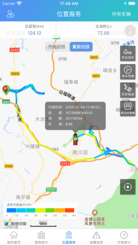 2.图表统计:实时掌控当前关注车辆的车速、转速、档位、里程、油耗、运行时间等;