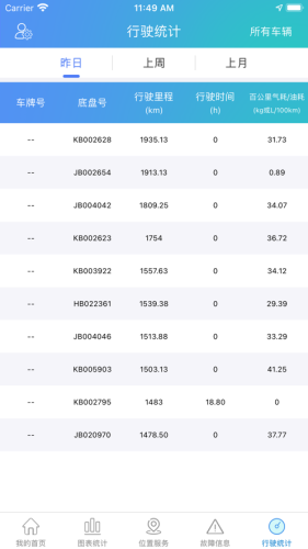 5.行驶统计:实时掌控当前关注车辆昨日、上周、上月累计行驶的数据统计;