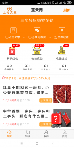 蓝天网转发文章赚钱平台,精选大量热门文章,转发分享至朋友圈,好友点击阅读赚佣金,还能通过收徒来拿提成,收徒越多赚得越多,每天花费几分钟,天天赚取佣金奖励。