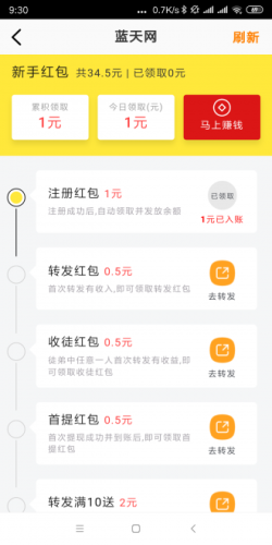 1、新人下载蓝天网就送1元,完成新手任务更有34.5元红包等你拿