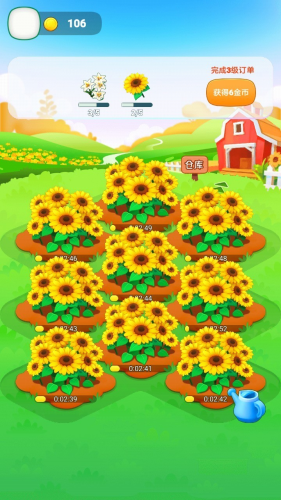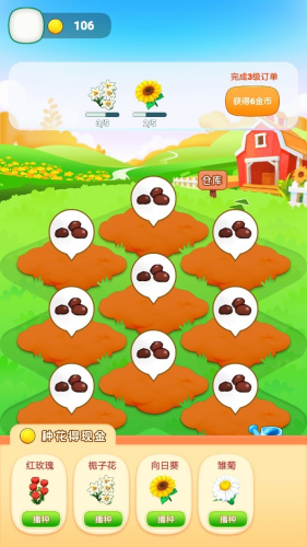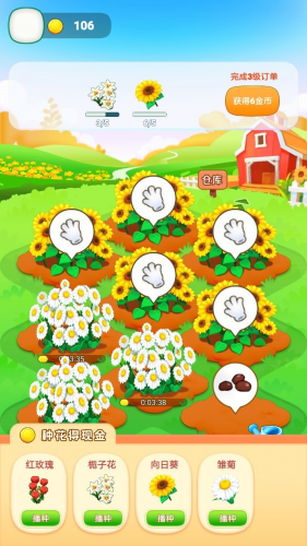 新人加入默认解锁7块地,每块地只允许种一种花,种子就在土地上面,一键点击播种,种下后过1~15分钟即可长大成熟,收获后可以循环种花。