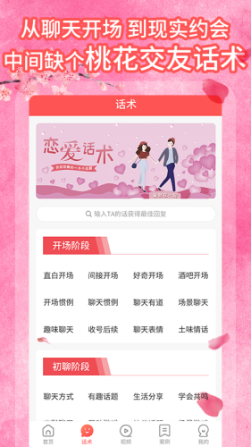 桃花交友话术是一款非常实用的聊天话术软件,软件功能非常强大,这里提供海量的聊天话术,多种类型的都有提供,当你遇到不知道怎样回复的问题的时候,来这里搜索轻松得到合适的话术。软件操作便捷,感兴趣的朋友快来下载吧!