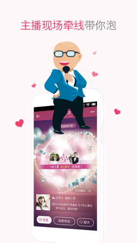 寻欢交友零门槛让你在手机上体验非诚勿扰,超多一千万人在这里与你相约,并有魅力主播教你谈恋爱,告别单身从这里开始。