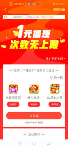 3、提现门槛低,满1元就可提现,试玩3个任务就可以提现,提现次数无上限。