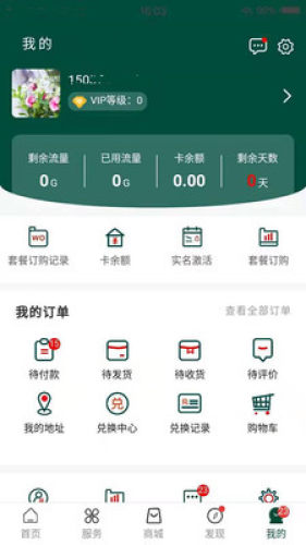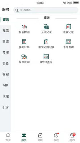 号卡激活、套餐订购、余额充值、明细查询、订购记录及进度查询。
