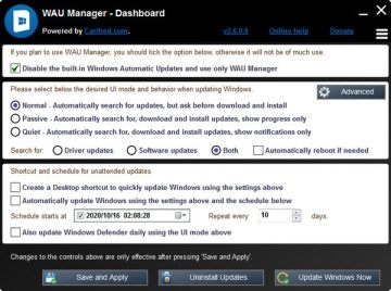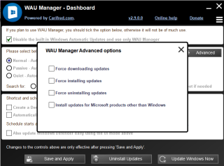 所有更新选项都可以通过WAU Manager控制面板对话框获得。WAU Manager不使用内置的WAU时间表,它包括自己的时间表,无论WAU是否启用,该时间表都可以工作。