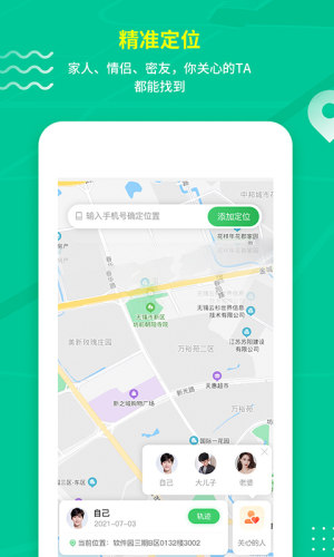 1、可以帮助您查找定位您关心的人的位置,实时发现Ta在哪,去过哪,保障他们的安全