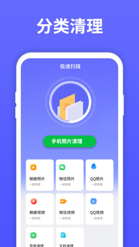 大文件,安装包,缓存,微信文件,微信视频,微信语音,扫描后可以手动选择清理无用文件。清理垃圾恢复空间轻松又便捷。