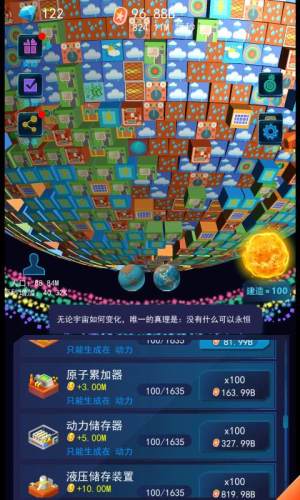 一款科幻风格的休闲放置游戏,在游戏中玩家可以从一个纳米开始创造属于你的宇宙,制作出各种基础的粒子,生成不同的微生物并不断进化成各种生物,真实模拟宇宙的起源,还可以用黑洞重新构建世界。