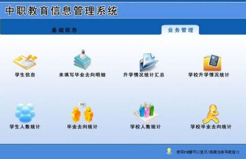 业务管理:学生信息、未填写毕业去向明细、升学情况统计汇总、学校升学情况统计表、学生人数统计、毕业去向统计、学校人数统计、学校毕业去向统计
