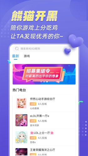 熊猫开黑app是一款陪玩交友平台,平台拥有多人语聊,技能陪练,动态社区等等功能服务,可以给予用户超棒的社交玩耍体验,觉得不错的朋友可以下载试试。